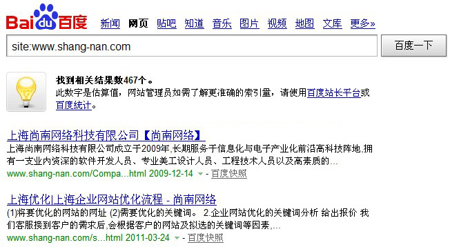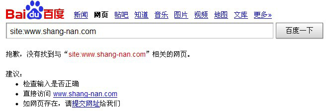 第一、首先通过site:指令来查询网站收录变化,比如说你的网址是www.shang-nan.com,就在百度里搜索“site:www.shang-nan.com”来查询你的网站收录情况,site指令查询结果主要有以下几种情况: